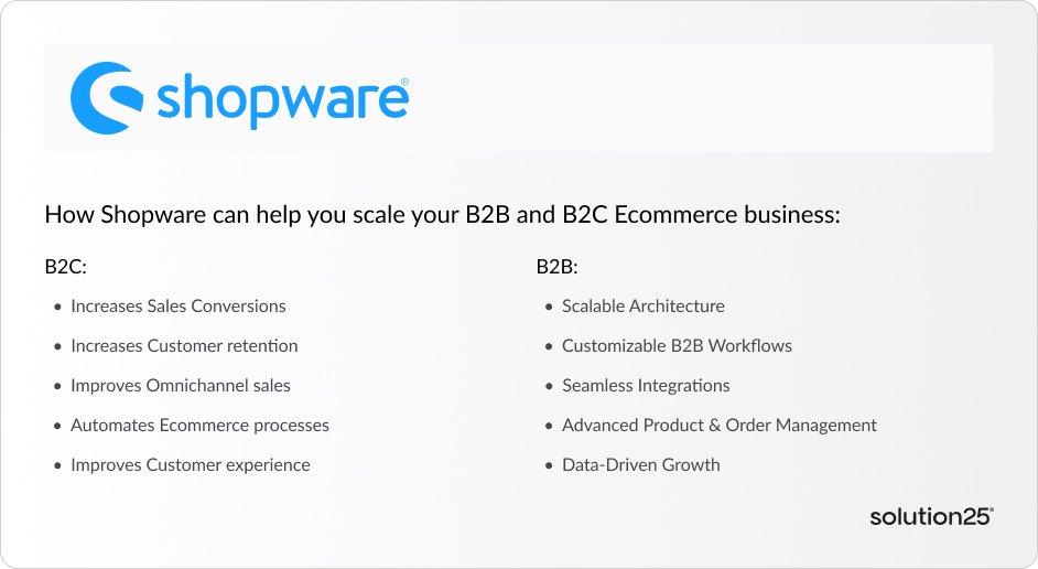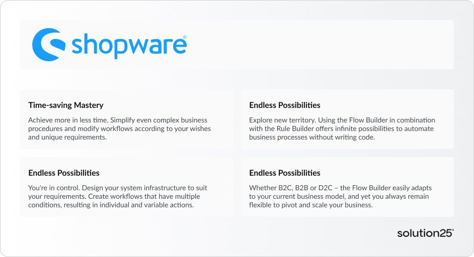 Diese Seite zeigt, warum sich 2025 immer mehr Unternehmen für Shopware entscheiden. Sie beleuchtet die Anpassungsfähigkeit der Plattform, ihre erweiterten Funktionen und zukunftssichere Architektur. solution25 veranschaulicht, wie sich diese Vorteile in strategische Mehrwerte für Händler übersetzen – von höheren Conversion-Raten bis hin zu nahtloser Skalierbarkeit.